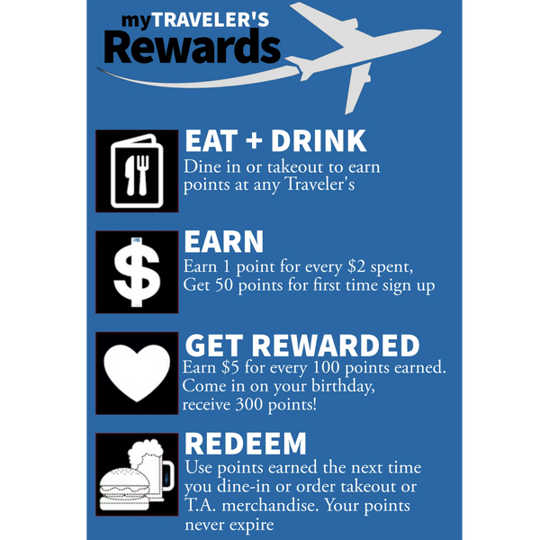 Every visit to Travelers Alehouse now comes with a little something extra. When you dine in, you earn reward points that add up to delicious perks — because loyalty should taste good.